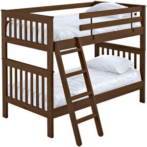 Mission bunk beds include a removable ladder that can be used on the front or ends of the bed. A full length rear guardrail and a removable front guardrail are included. Options include extra-long for big kids and a taller version to allow 8” more headroom under the bed for comfortable seating. Add optional drawers or a trundle bed for maximum use of your floor space. Ready for a mattress, no foundation required. The top of an 8” thick mattress will be 21" off the floor on the lower bed and 57” off the floor on the upper bed. (65” on Tall models).