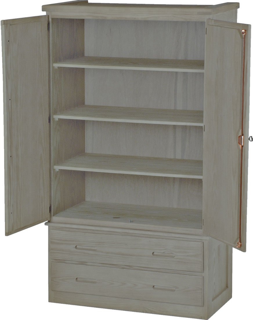 Full width hanging space and a storage shelf plus locking doors.This unit can be separated into top and drawer unit for difficult installations.