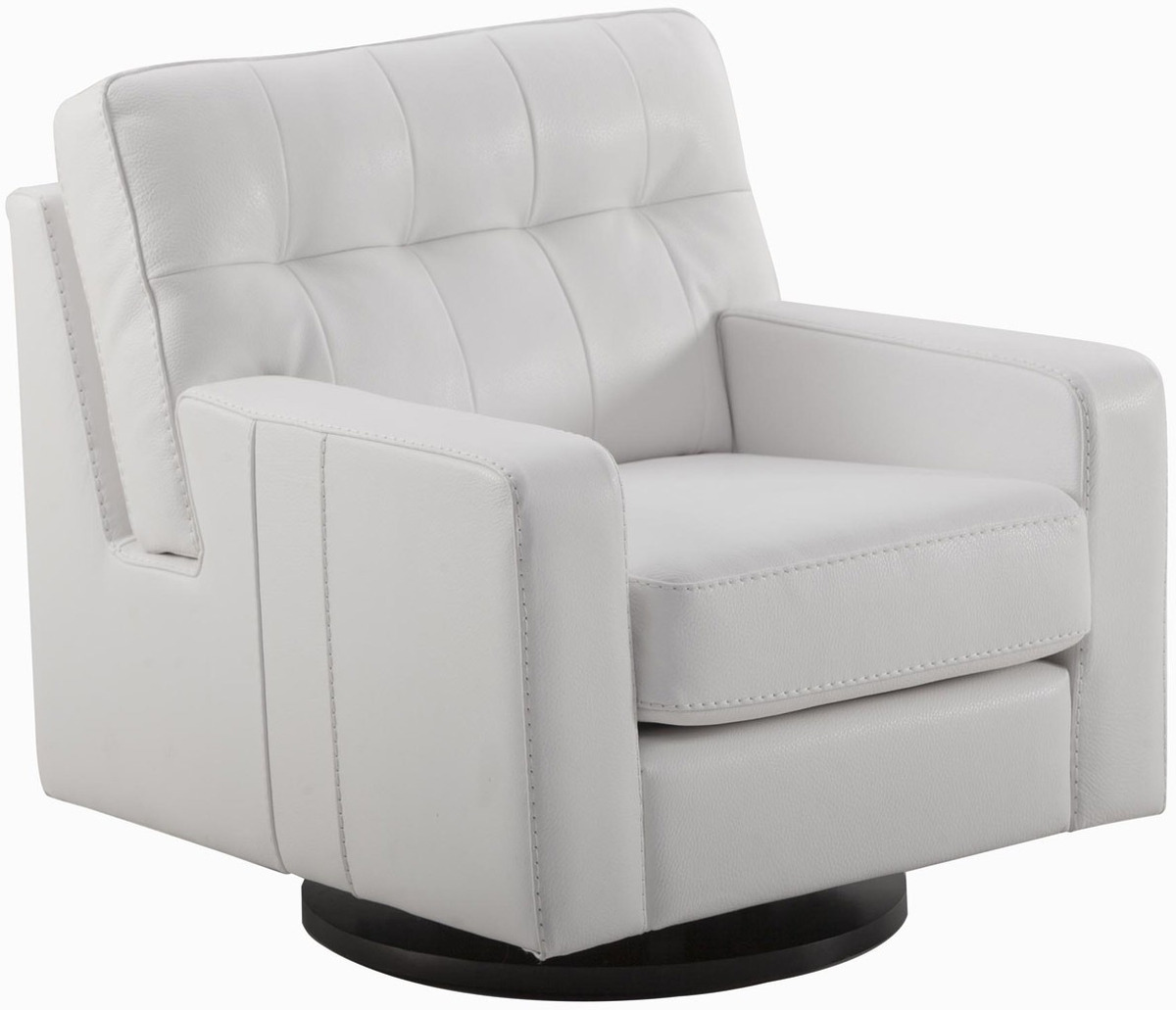 This swivel and rocking chair features a seat cushion upholstered with shaped foam, stitched detailing, tufted back cushion, and is made of leather.Read More