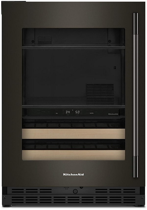 Features two lower racks for up to 14 bottles of wine and two full-width upper shelves for drinks and food. Now you can store sodas, seltzers and syrups along with cheese plates and charcuterie boards.