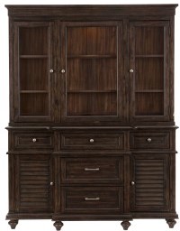 The solid transitional styling of the Cardano Collection creates an impactful design presence in your dining room. Pewter-finished hardware mounted on the functional drawers and doors of the china and server provide subtle contrast to the wood’s dark finish. The behind glass door shelving of china top allows for convenient and unobscured access to your decorative tabletop accessories, while the buffet server, with its wood door and drawers, serves dual purpose as the china’s base and as a stand-alone sideboard.