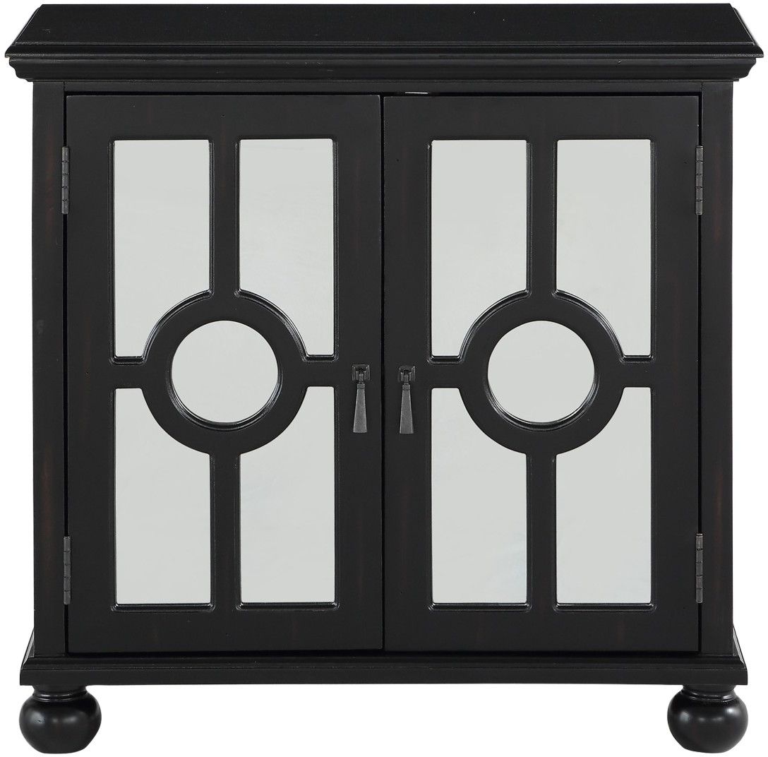The Poppy Collection provides classic accent to your home's décor while meeting your storage needs. The modern traditional design of the cabinet features behind door shelving, turned support feet, black finish, circular themed decorative mixed-media glass and wood doors, and antiqued brass hardware. Also available in aqua and white finish.Read More