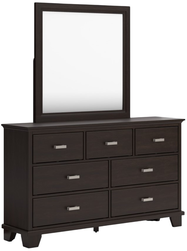 Feast your eyes on this richly versatile dresser with mirror. Its traditional-inspired dark brown finish effortlessly blends with contemporary bright nickel-tone pulls to create a stunning look that's not too stuffy or too trendy. Spacious drawers offer plenty of storage for your wardrobe and spare bed linens.Read More