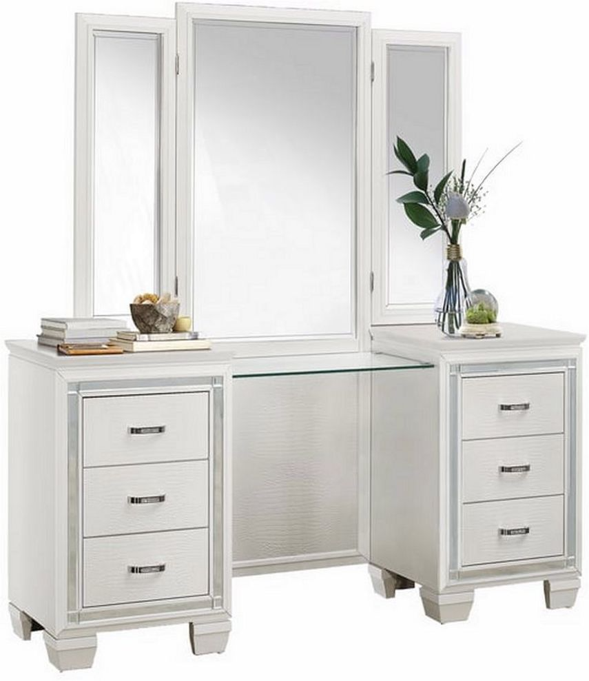 Glamour reigns in the design of the Allura Collection. Framing the vanity dresser and mirror is a decorative beveled mirror accent. Alligator embossing and high polished crystal-enhanced hardware boldly accent the white finish.Read More