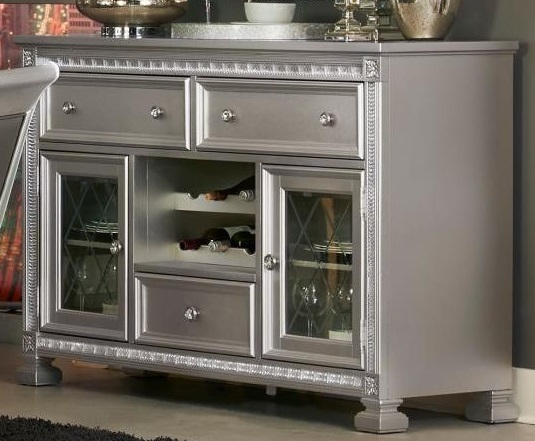 Modern glamour is exemplified in the design of the Bevelle Collection. Acrylic crystals frame each piece in the collection, reflecting the light to create eye-catching drama. The silver finish serves as the perfect complement to the high-polish decorative knob hardware of the china and server while medallion accents grace all pieces. Providing contrast to finish is the dark gray bi-cast vinyl of the side chairs and arm chairs. A coordinating bedroom is also available.Read More