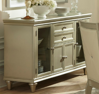 The look of traditional design is updated for the modern traditional home in the Celandine Collection. The table leg of the collection stands proudly as the main platform of your formal dining room. Crystal tufting immediately draws the eyes to the subtle pearlized finish of the bi-cast vinyl chair backs, while high polished knob hardware stands out from the silver finish of the server. Inset glass highlights the shagreen embossing accent of the table’s top and server top. The server features shagreen drawer fronts, built-in wine rack, drawer and behind door storage. With each of the aforementioned elements, subtle glamour will be achieved in the design of your elegant dining room.