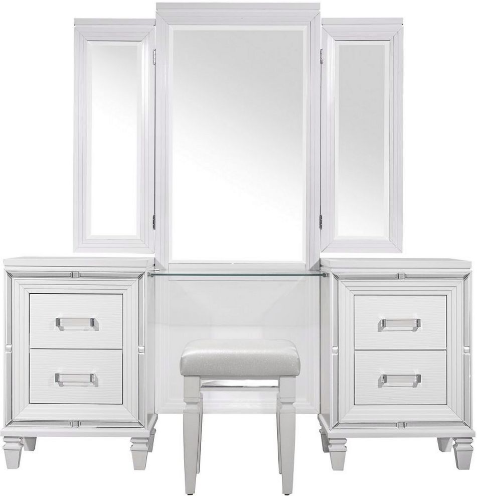 Mirrored framing provides dramatic enhancement to the vanity, illuminating the silver-gray finish. Acrylic hardware provides unobtrusive decorative touch to the drawer fronts of the vanity while the tri-panel mirror is paired with drawer storage creates the perfect platform to prepare your glamorous self.Read More