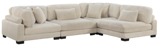 Configurable to your available space, the Traverse Collection allows for the addition and detachment of pieces for a customized seating experience. The 4-piece sectional configuration consists of two corner units paired with two armless chairs. The plush beige corduroy fabric upholstery creates a plush expanse for a soft touch experience.Read More
